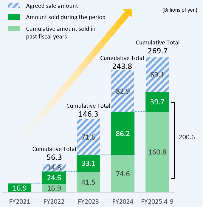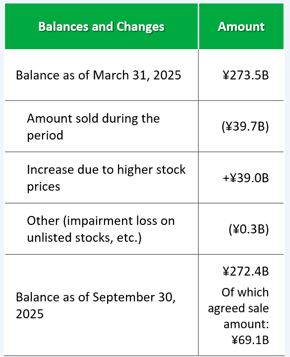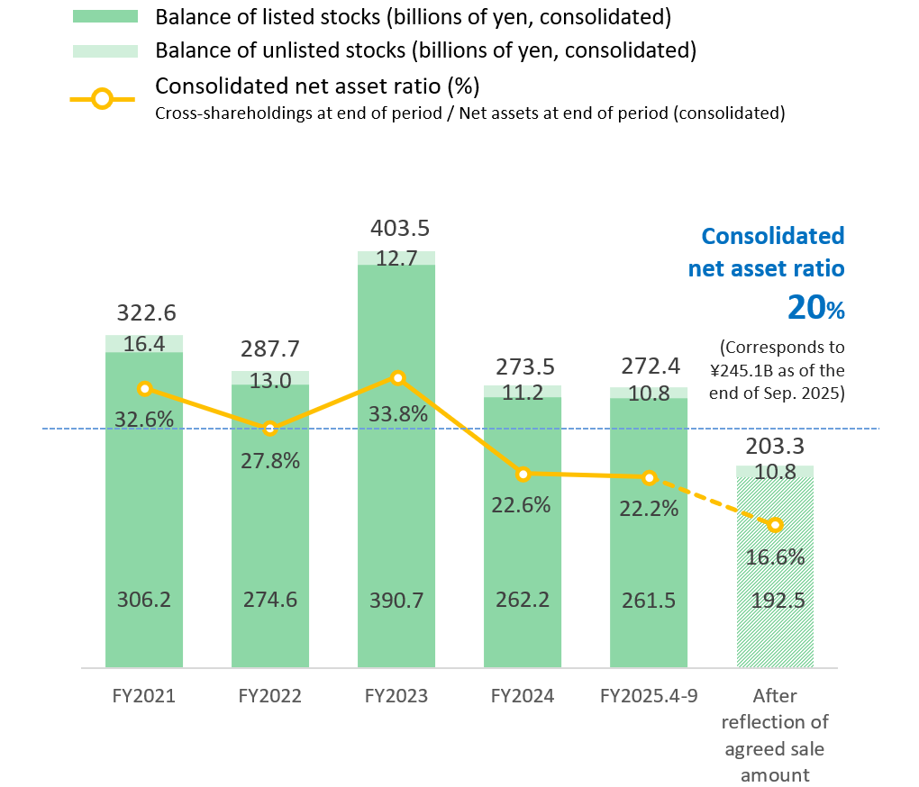 The Medium-Term Business Plan 2022 states that the Obayashi Group will proceed further on reassessment of the significance of owning shares and overall investment efficiency for the Company. We have reduced cross-shareholdings, aiming to bring the ratio of cross-shareholdings to 20% or less of consolidated net assets by the end of March 2027. The balance of cross-shareholdings as of September 30, 2025, accounted for 22.2% of consolidated net assets, down 0.4 percentage points from the end of the previous fiscal year. This was mainly due to the progress in selling cross-shareholdings, despite a significant rise in the share prices of those holdings. We will further accelerate the sale of cross-shareholdings to achieve our target.