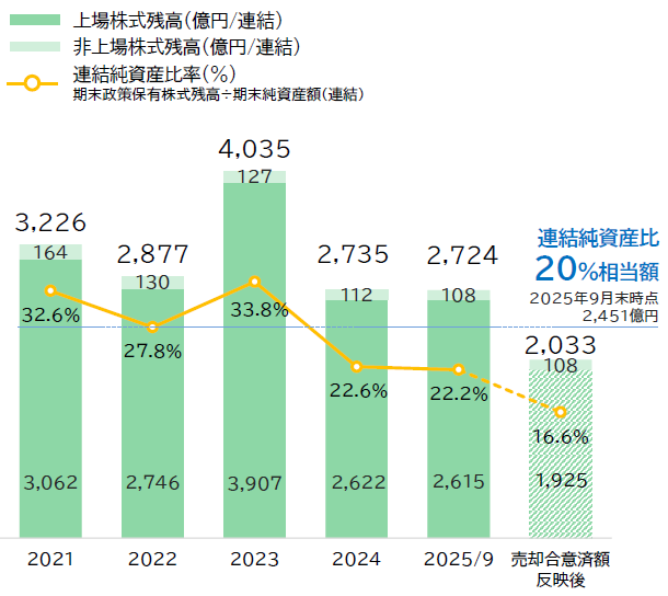 2025年9月末の政策保有株式の保有残高が連結純資産に占める割合は22.2%となり、2025年3月末より0.4ポイント減少しました。これは、保有株式の株価が大幅に上昇した一方で、政策保有株式の売却が進捗したことなどによるものです。目標の必達に向け、さらなる売却の加速に努めていきます。