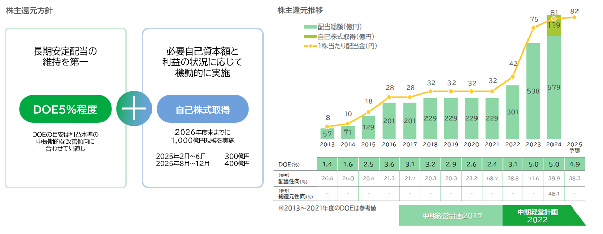 当社の株主還元方針は、長期安定配当の維持を第一としています。これにより、中期経営計画2022においては「自己資本配当率(DOE)5%程度」を目安とした普通配当を行う方針としています。自己資本配当率(DOE)の目安は、利益水準の中長期的な改善傾向に合わせて見直していきます。